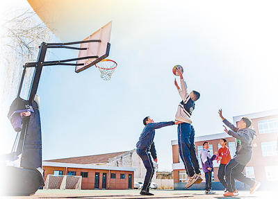 山西岚县普明希望小学,孩子们在打篮球。马梦迪摄