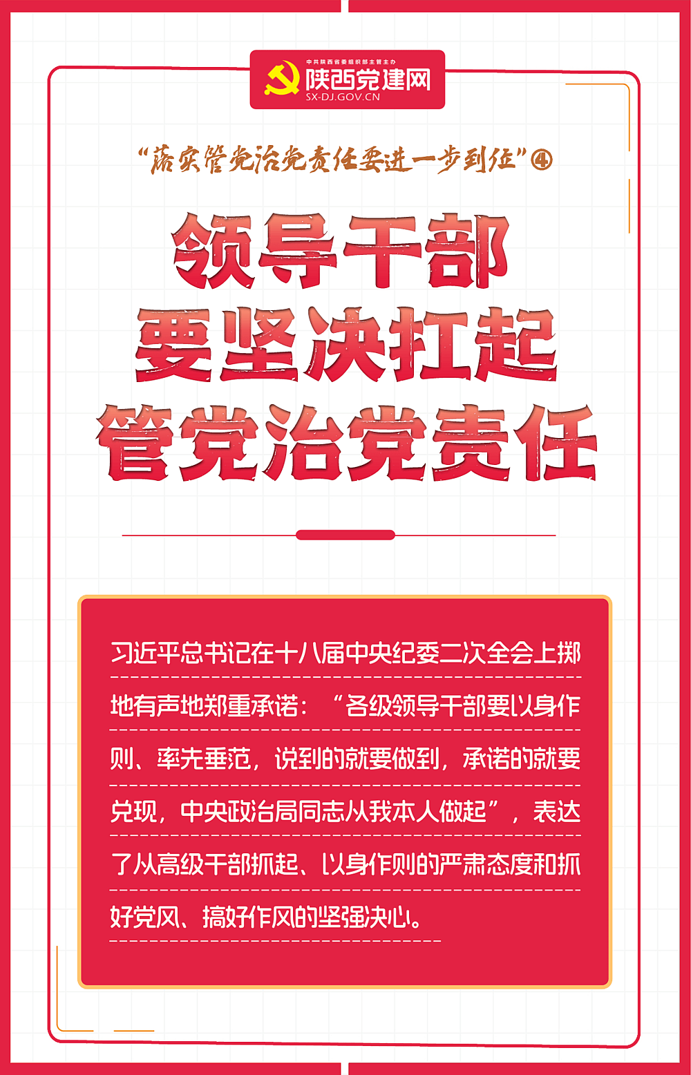 各级领导干部要把落实管党治党政治责任作为最根本的政治担当,无私无畏、旗帜鲜明,敢于斗争、善于斗争,坚持抓领导、领导抓,一级示范给一级看、一级带领着一级干,压紧压实全面从严治党政治责任。